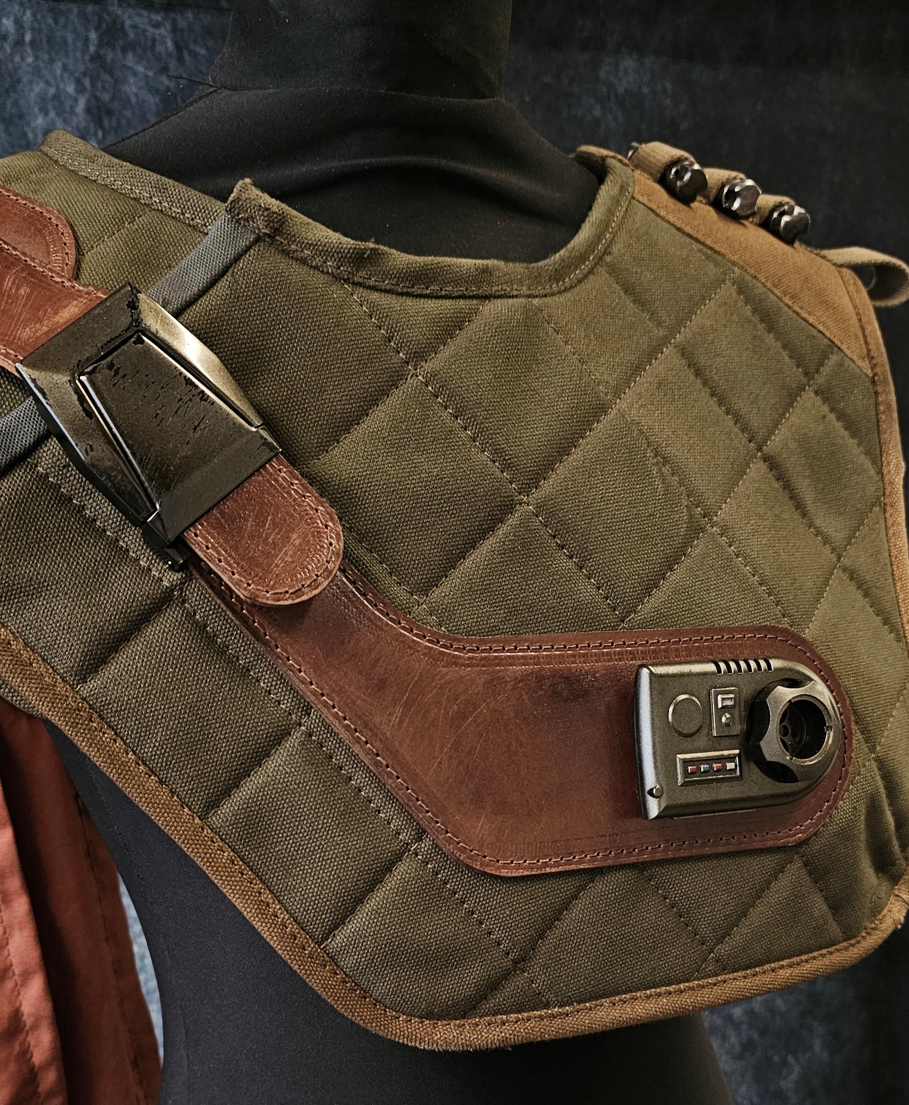 Made from cotton canvas and leather, with detachable shoulder cape.
