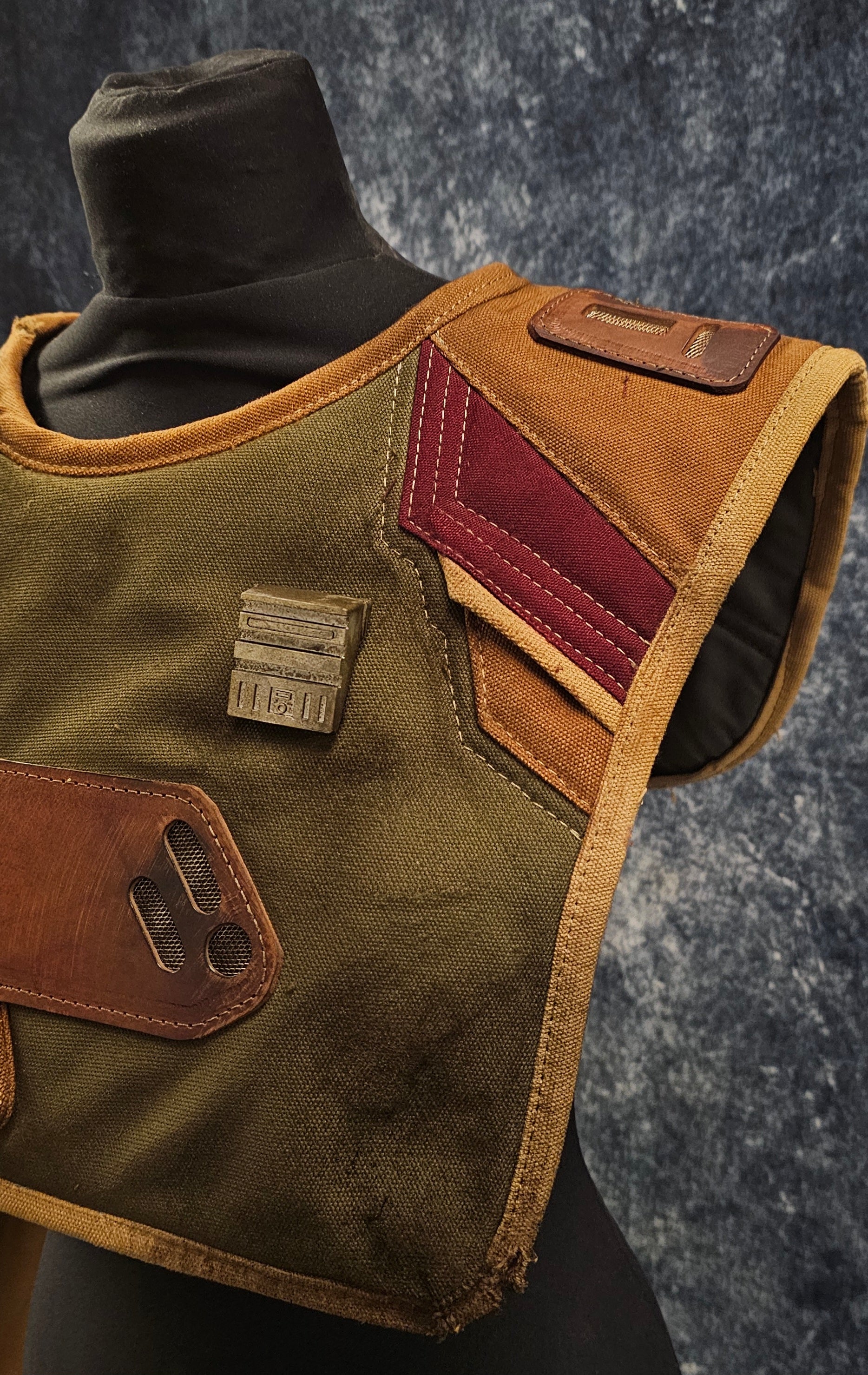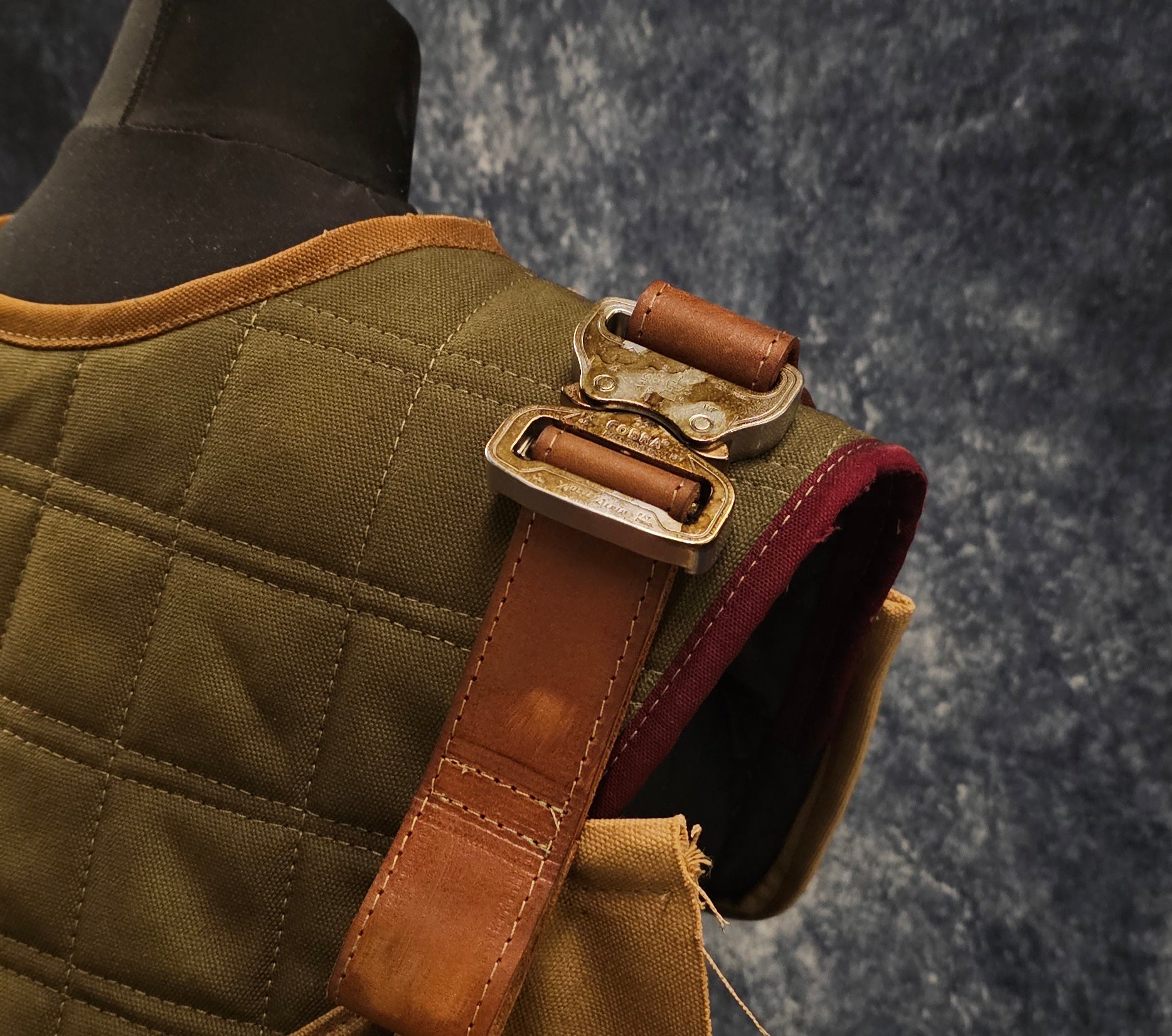 Made from cotton canvas, and leather, with detachable shoulder cape.